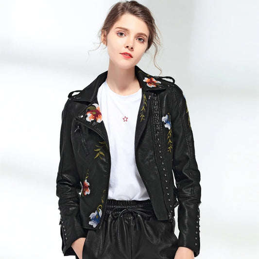 Women Retro Floral Print Embroidery Faux Soft Leather Jacket Coat Turndown Collar