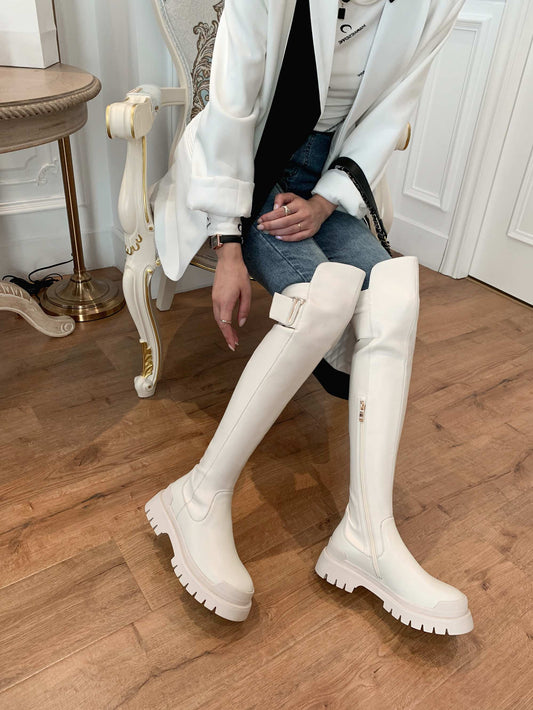 Leather platform thigh high boots round toe casual winter shoes Chunky flats